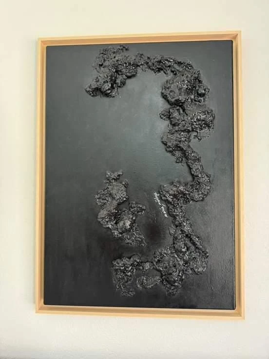 La segunda obra de Sombras de Reconocimiento es completamente negra, creada a partir de una figura abstracta que sugiere la presencia. La textura generada añade un nivel táctil y visual que intensifica las luces y sombras de la pieza. La superficie rugosa y tridimensional permite que la luz interactúe de manera única, creando variaciones en la intensidad de las sombras y resaltando las formas sinuosas que evocan el movimiento y la transformación. Aunque no se representa de manera explícita, la figura emerge a través de las sombras y texturas, transmitiendo sensaciones de poder y misterio. El uso del negro absoluto refuerza la atmósfera de lo oculto, mientras que la textura invita a una interpretación más sensorial y subjetiva, en la que el espectador puede sentir y percibir la obra de manera dinámica.